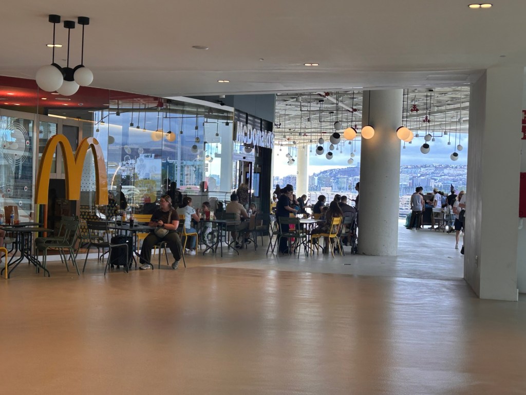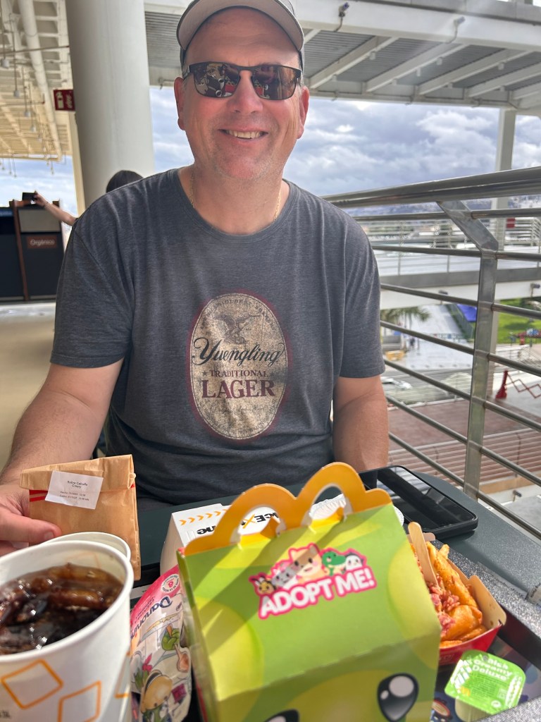 We found a Burger King and McDonald’s on the island – and yes, we stopped at McDonald’s! We got a Happy Meal, a Double Dip burger (served with dipping cheese sauce), and ate outside overlooking the harbor.