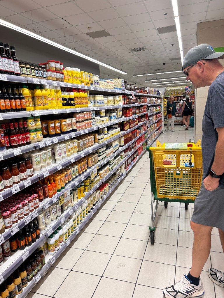 On our way back to the ship we stopped at the Dino Supermarket – Adam’s favorite! It was busy with tourists, crew members, and local shoppers. We found snacks and pop to hold us over for our 9-Sea Day stretch. Of course, Adam got some mayo to bring home!
