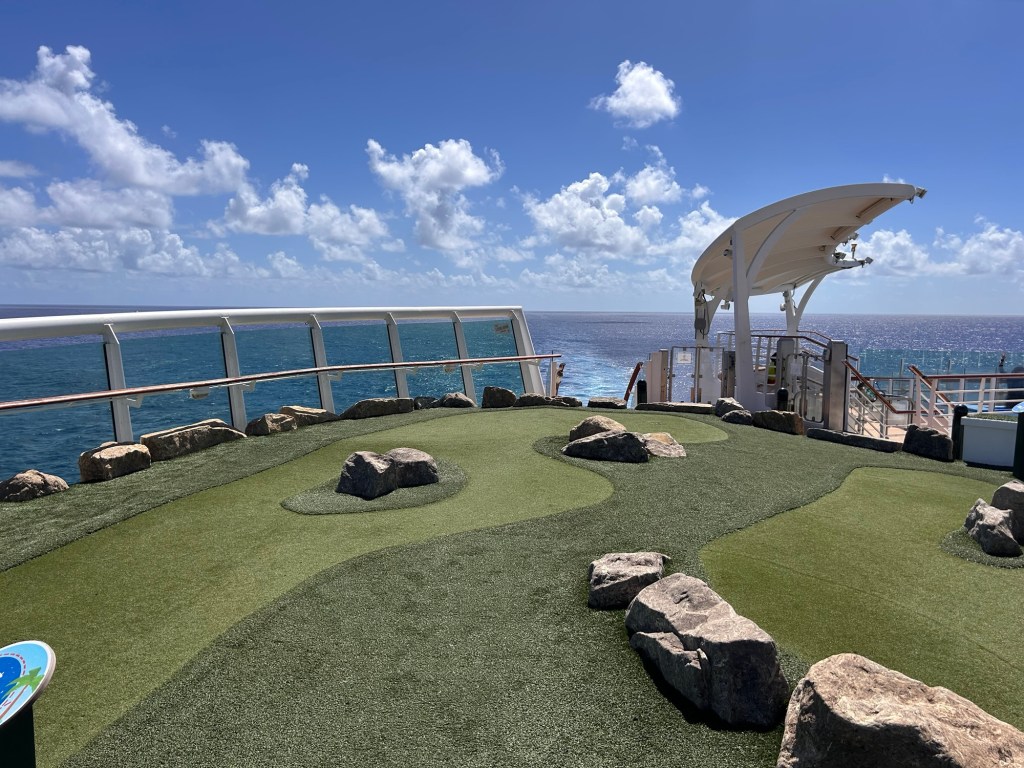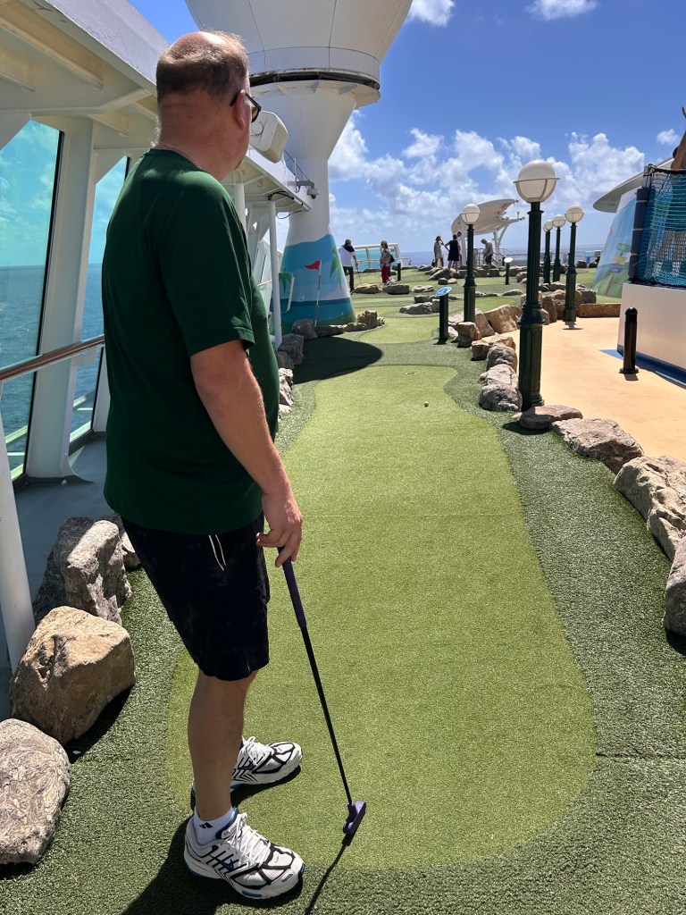 We finally got a couple games of mini-golf in. Despite my under par start on hole 1 – I lost both games! By a lot! It didn’t help that the ball blew off the course and the ship tilted just as I was about to finish my shot.